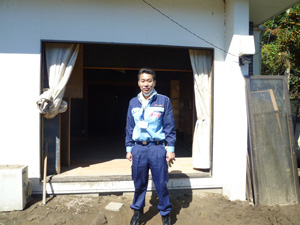 私達のグループの担当は熊野川沿いにあるお医者さんの医院兼自宅です。川沿いの自宅は二階部分まで水で浸かり、二階のテラスの物置まで水の力で移動させられていました。つまり一階は全部浸水していたことになり、室内は泥と使えなくなった家具などどこから着手したら良いのか分からない状況でした。