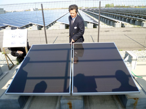 堺太陽光発電所の定格出力は1万kW、太陽電池の枚数は実に7万枚に及びます。敷地面積は約21ヘクタール、発電電力量は年間約1,100万kWhにもなります。巨大なメガソーラーを見せてもらって、これからの可能性を秘めていることを実感しました。太陽光発電は補完エネルギーの位置づけですが、今では無くてはならない再生可能エネルギーのエース的存在になっています。