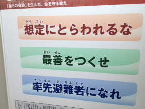 そして展示パネルではみっつのことを訴えています。津波から命を守るために必要な三原則として、想定にとらわれるな。最善をつくせ。そして率先避難者になれ、のみっつです。想定にとらわれない。これは避難場所として指定されている地域や建物は必ずしも安全とは言えないので、可能な限り、より高いところへ、より安全な場所へ避難する行動をとることです。マニュアル通りの行動ではなく自分で考えた行動することを求めています。