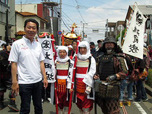 太田城のシンボルキャラクターは、当時、太田城に篭城して敵軍と戦ったとされる尼僧の「朝比奈摩仙名(あさひなませんな)」をモデルにした「ませんなちゃん」です。地元の女の子が「ませんなちゃん」に扮して、子ども神輿と共にJR和歌山駅東口付近まで歩きました。