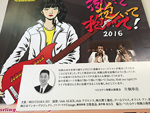 坂本つとむさんとケンイチ大倉さん二人、「つと☆ケン」が和歌山市に戻ってくれました。今回のライブのタイトルは「抱いて、抱いて、抱いて!2016」で、二人の他に地元和歌山のアーティスト4組も登場してくれました。和歌山市を盛り上げようと企画したライブだったので、会場に熱気は充満しました。