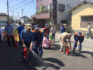 続いての消火訓練では水消火器を使用して、消火器の使い方の体験をしました。分かっていても緊急時にできないことがあります。消火器は身近な機器ですが、使ったことのない人が多いと思います。安全ピンを抜いて3メートルから5メートルの距離に近づいて消火することを知るだけでも役立ちます。消火器の噴射時間は15秒程度なので、それを知っておくことで、自分が消火できる火災なのかそうでない火災なのかが判断できます。できると判断すれば消火活動を行い、無理だと判断すれば現場から離れることです。