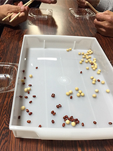 余興として議会報告会と意見交換を終えた後にゲームを行いました。「豆つかみ競争」です。ボウルに豆や小豆を50個入れておき、6人で一つのチームを構成し、お箸を使って早くボウルから全ての豆を取り出したチームが勝利するというゲームです。