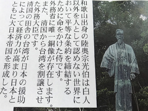 「和歌山出身の陸奥宗光伯は白人以外を人として認めない世界において平等な条約を締結するために命をかけた侍です。外務省に唯一銅像が存在します。また、清国から台湾を割譲させた外務大臣です。清国の田舎の台湾が日本の援助によって経済力が高まり日本とともに大日本帝国を形成した」という内容です。