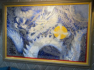 少しの時間差で田村さんに会えませんでしたが、訪問の目的の一つである100号のキャンパスに描いた大作「幻神白龍」を鑑賞しました。100号に描かれた白龍には流石に圧倒されました。田村さんは寺院や建物の天井や壁に作品を描くことが多数あり、これまでも奉納した天井画を見ていたので、その作品の迫力は想像していましたが、生の白龍の迫力には驚きました。左手に玉を持った白龍が進行方向を向いているのは、未来を見ているからだと思います。正しい未来に誘導するために、玉を授けるべきリーダーとなる人物を探しているようです。