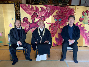岬町の宝樹寺を訪れ、住職から寺院内にある赤龍と阿弥陀如来の金屏風を見せていただきました。作者の田村画伯も寺院に来てくれて屏風の説明をしてもらいました。この金屏風絵は思っている以上に大きく絵に迫力があります。
