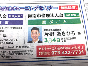 和歌山新報に3月4日の海南市倫理法人会での講演会の案内記事が掲載されたこと。講演テーマは「慶びごと」です。 - 議会報告会に参加してくれた皆さんから嬉しい意見をいただいたこと。Mさんは「毎月一回のこの報告会に来ることを楽しみにしています」。Fさんからは「こんな楽しくて為になる勉強会は他にありません。実施していることを誇りに思います」と話してくれました。